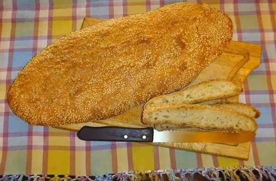 The ground sesame seed is sweetened either with honey or “petimezi,” the syrup derived from the must of grapes, and is then given a round shape and baked as a loaf.