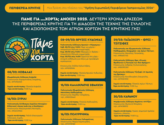The action that is part of the “Crete European Region of Gastronomy 2026” project is called “Let’s go for … greens”, and was very well received during its first year of implementation this year it will be developed in collaboration with 18 Associations with experiential actions in 14 locations throughout the prefecture, from February to April.