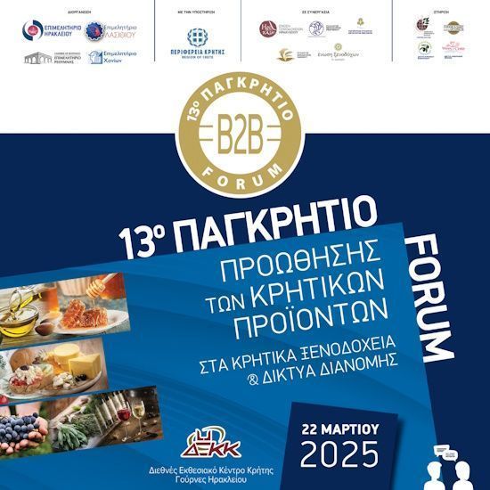 The 13th Pan-Cretan Forum is organized this year again by the four Chambers of Crete, the Hoteliers’ Associations of Crete and the Pan-Cretan Association of Hotel Managers, with the support and under the auspices of the Central Union of Chambers of Greece and the Region of Crete.