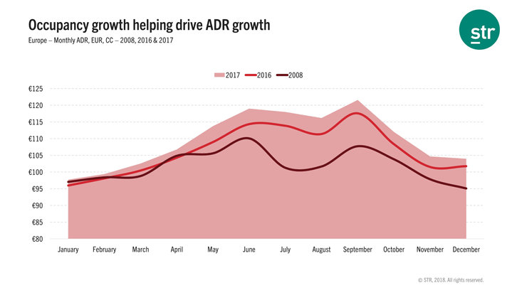 In addition to rising 2.4% over 2016, Europe’s occupancy level in 2017 was nearly 10% higher than the previous peak in 2008, which came before the global financial crisis. Rossmann noted that Europe’s performance has benefited from supply growth remaining relatively limited in most markets since 2011. This, coupled with steady demand growth, has allowed hotel operators to capitalize on heightened occupancy levels by driving rate growth. During the months of July, August and September 2017, Europe recorded double-digit ADR growth compared with those same months in 2008.