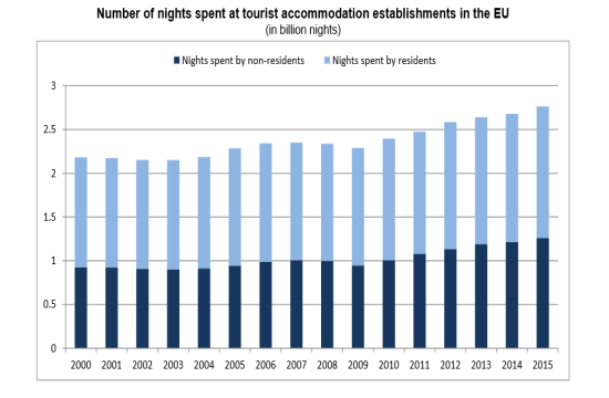 Since 2009, there has been a steady increase in the number of overnight stays in the EU, notably driven by the rise in the nights spent by non-residents, the Eurostat said in a report.