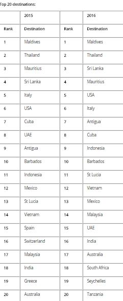 The Maldives took the overall top spot, with Thailand and Sri Lanka ranking as second and third best sellers.