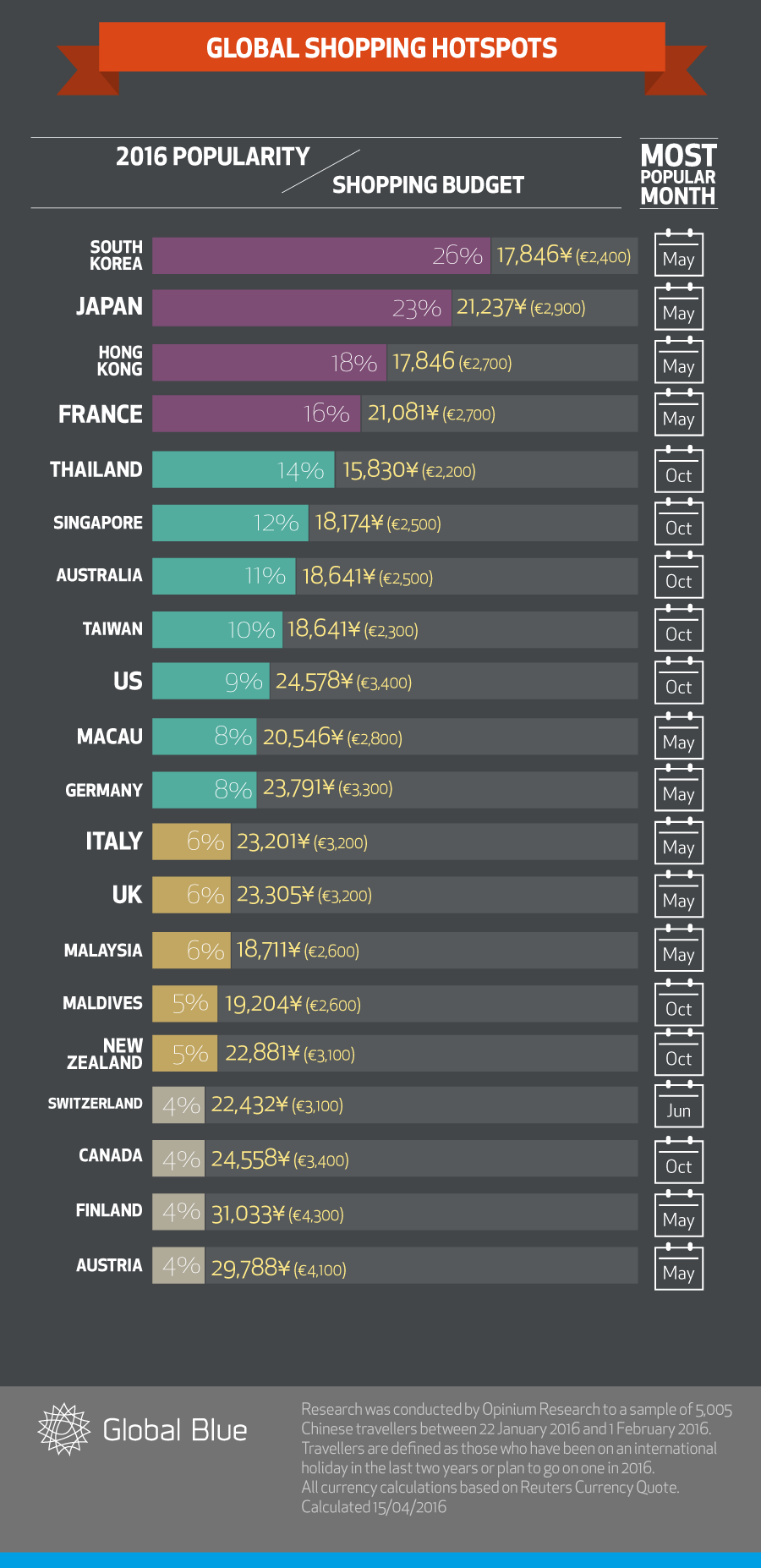 May 2016 is expected to be the most popular month for travel to Europe, Japan and South Korea, while October 2016 will be popular for visits to other Asia-Pacific destinations, such as Australia and Singapore. These two key months coincide with major Chinese holidays: Labour Day (May 1-4) and Golden Week (October 1-7).