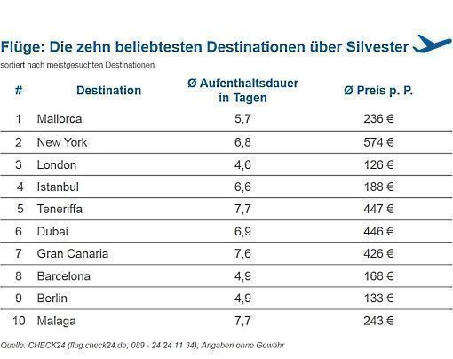 Most Germans will travel by air to Mallorca, New York and London, for New Year’s Eve, according to a survey of the German airline booking platform CHECK24.