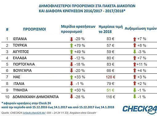 The data, which refer to bookings for holiday packages from 15 December 2017 to 14 January 2018 record a 12% decrease in Greece’s booking share compared to the same period last year, along with a 7% rise in prices to EUR 80 per day.