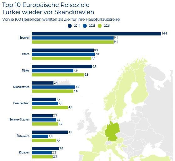 – While Spain (from 14.4% in 2014 to 9.1% in 2023 and 2024) remains the most popular holiday destination for Germans, its current value is noticeably lower than the 2014 level. Italy, on the other hand, has seen little change and maintains a stable position.
