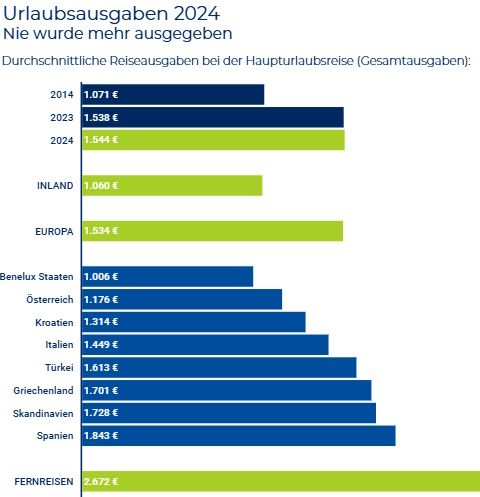 In terms of spending, the average spend in 2024 in Europe amounted to 1,534 euros, with the average holiday spend in general in 2024 amounting to 1,544 euros per person, remaining almost at the levels of 2023 but 50% above 2014.
