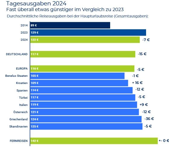 In Spain and Austria, vacationers also spent around 10% less per day on average. In contrast to this general trend, daily costs increased in Croatia and Turkey.