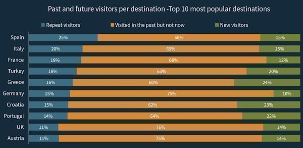 In contrast, most of the repetitive visitors are concentrated by Spain (25%), Italy (20%) and France (19%). Repeated in Greece are 16%in Croatia at 15%, in Portugal at 14%and in Turkey at 18%.