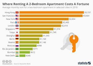 In many major European capitals, renters also need deep pockets. In Paris and London for example, a 2-bedroom apartment would average $2,400 a month in rent. Even though Berlin was once labelled “poor but sexy” by its mayor, it is now home to the fastest growing property prices of any city worldwide. At the moment, a 2-bedroom flat is still generally affordable at about $1,160 a month. Rents are far lower in developing countries, even in India’s booming tech hubs. In Mumbai, a 2-bedroom flat would cost $612 a month to rent while in New Delhi it would be $346.
