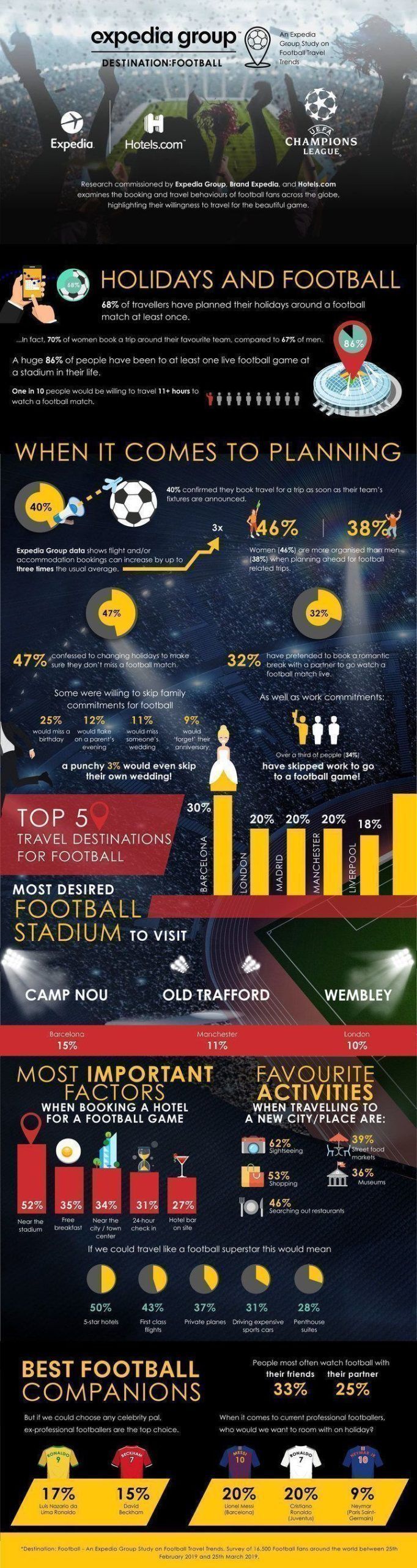 “We’re excited to be releasing the first cross brand Expedia Group study, looking at how the most passionate fans in the world travel.” said Adam Jay, President of Hotels.com Brand. “We know football fans look forward to booking trips early to avoid missing out on the action. By offering fans great options on flights, accommodation or activities across our Expedia Group brands, we want to make sure the only stress you experience is the nail biting 90 minutes of the football game.”