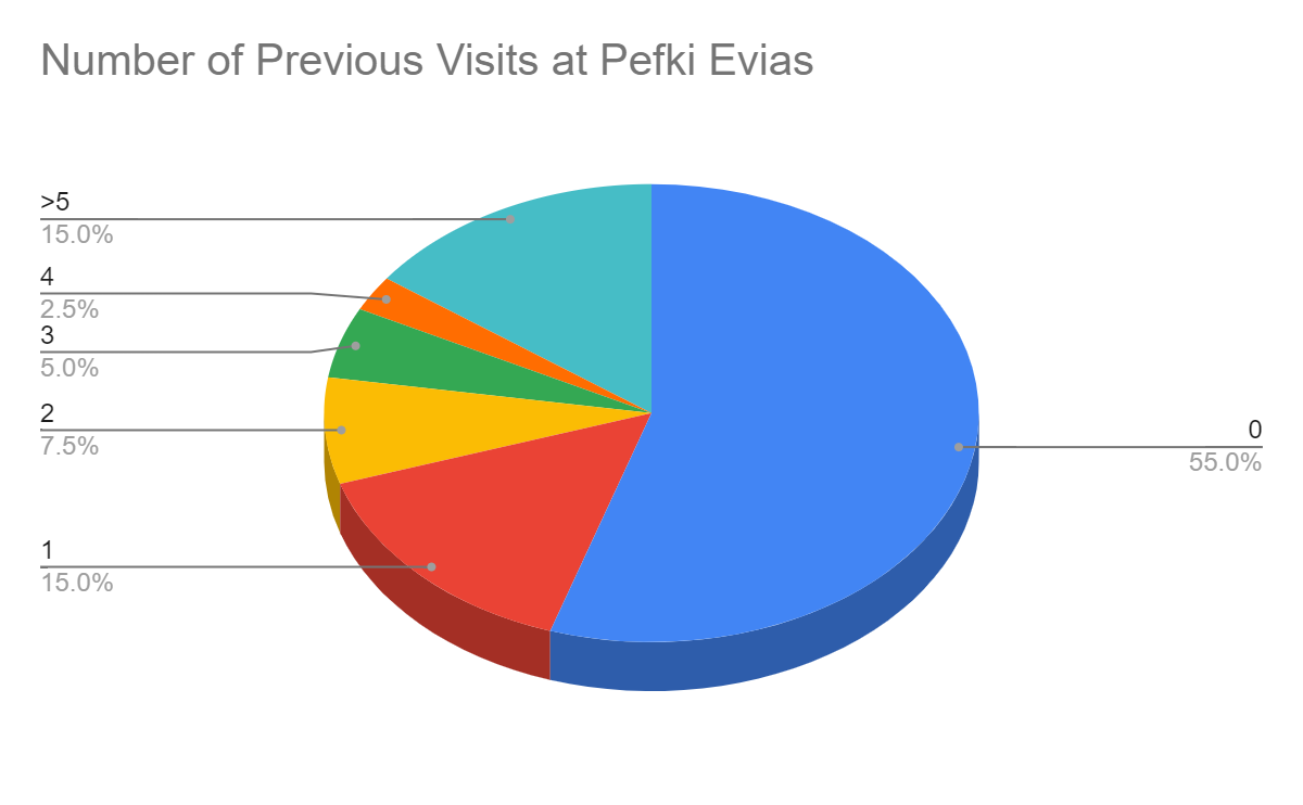 With regards to the Authentic Marathon Swim at Pefki, the major implication is that the event contributed into increasing the traffic in the area, early in July when the peak season has not yet started. Despite the fact that the destination awareness among the respondents was relatively high, 75%, but the majority of the participants (55%) had never visited Pefki before as exhibited in the figure below.