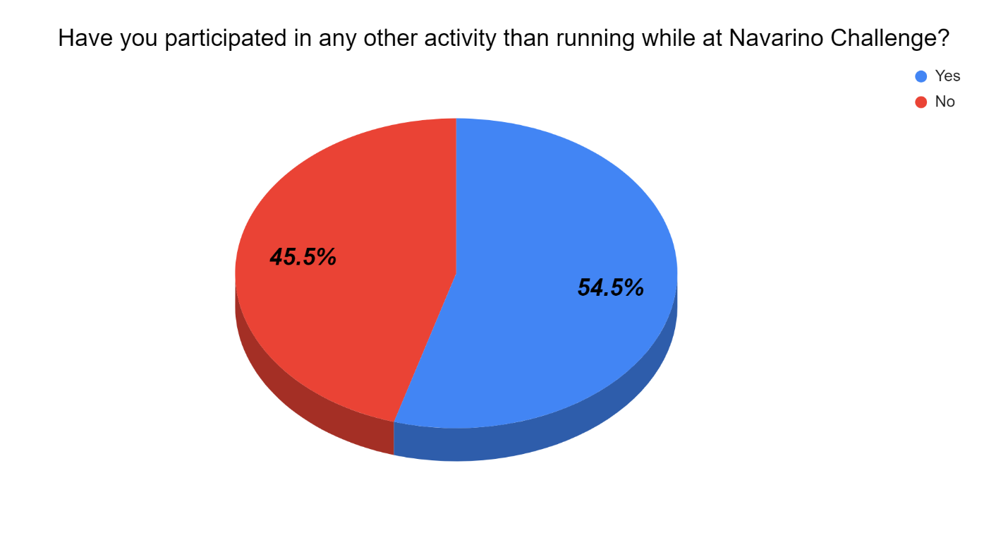 Regarding the Navarino Challenge event, a different narrative is evident. Although it revolves around three running trails, the attendees may also engage in a multitude of sports & wellness activities, i.e. beach volley, pilates, spinning, tennis, etc. The participants by majority make use of this opportunity, therefore experiencing a sports retreat. It is noteworthy that only 9.1% are professional athletes, while the majority self-identify as amateur and recreational athletes.