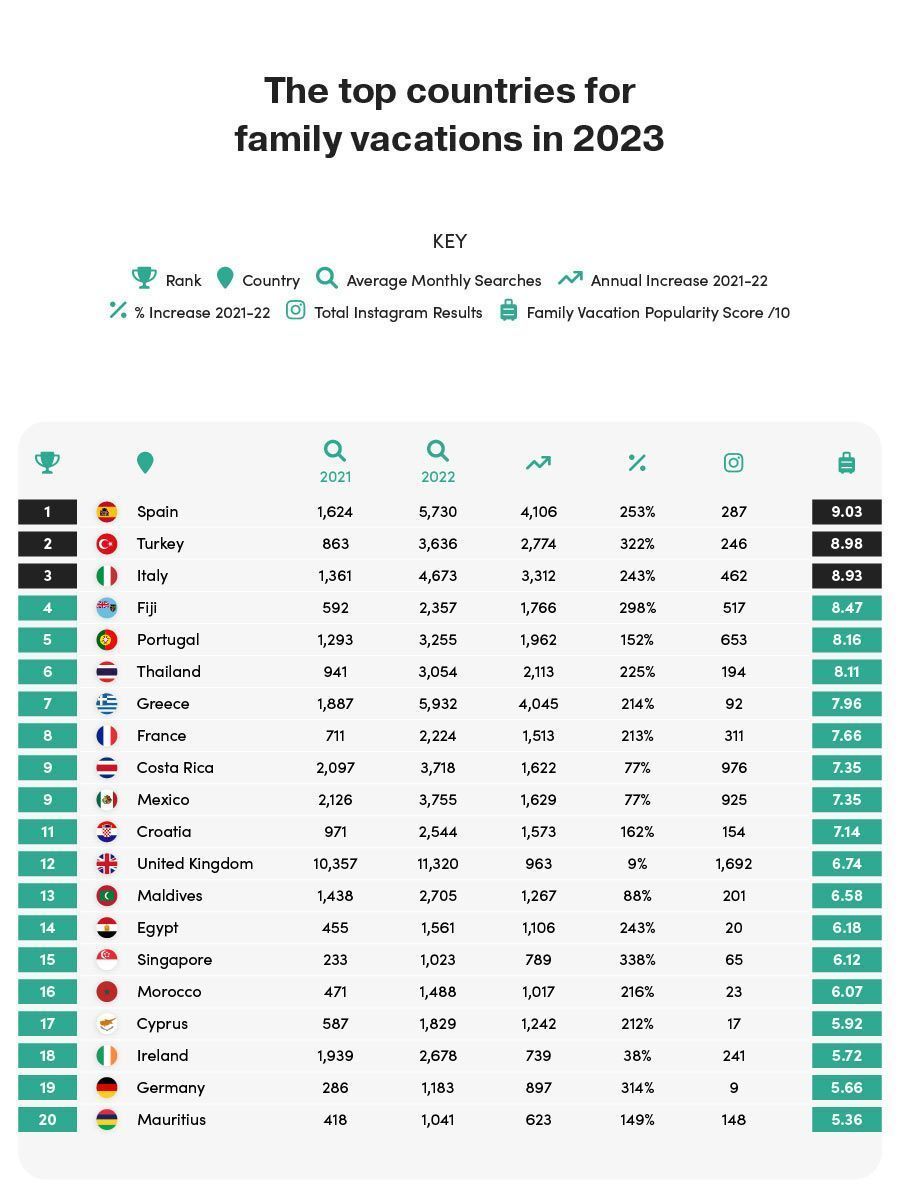 Spain is set to be the top country for family vacations in 2023, having received a fantastic Family Vacation Popularity Score of 9.03! Spain is one of the most sought-after countries for family vacations, with an average of 5,730 searches each month in 2022.