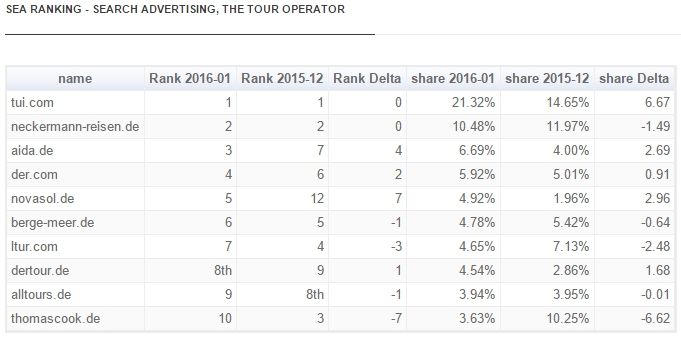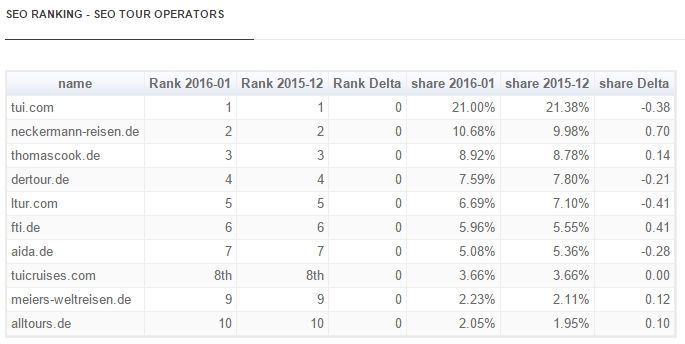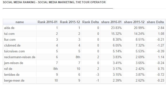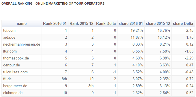 The survey examined the successful online presence and marketing among 250 members of the German Tour Operators Association (DRV), in January 2016. TUI (19,2% share), Aida (11.8% share) and Neckermann-Reisen (8.3% share) retained the top rankings they held during December 2015.