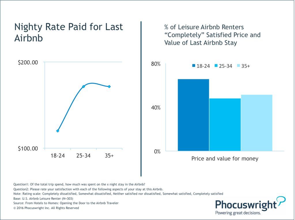 For example, while younger consumers typically have a passion for seeing the world, they often travel on a tight budget. Tastes and preferences, however, generally become a bit more expensive a few years down the road, once travelers get a bit older and settled into their careers. These general patterns in leisure travel spending are becoming increasingly apparent among Airbnb renters. According to Phocuswright’sFrom Hotels to Homes: Opening the Door to the Airbnb Traveler, leisure Airbnb renters between the ages of 18 and 24 paid roughly $100 per night for their last Airbnb (see Figure 1). Nightly rates, however, spike among older age groups, generally closer to $200.
