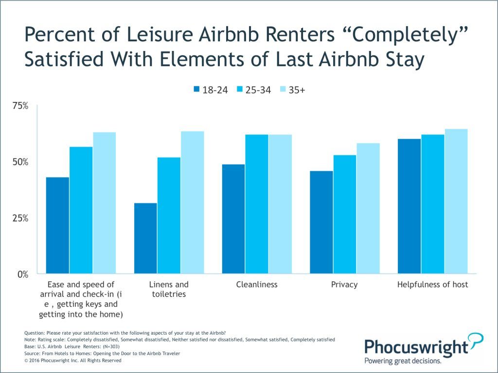 Younger Airbnb’ers truly appreciate the low-cost lodging options made available by the private accommodation brand. Compared to older groups, younger renters were significantly more likely to be “completely” satisfied with the price paid and value of their last leisure Airbnb stay (see Figure 1). Low prices are important to them because it simply makes travel possible. Older renters, however, may not have been as satisfied or concerned with price because other elements of the travel experience become more important with age – such as splurging on nicer listings with better amenities and more comfort. When asked to rate different elements of their last Airbnb stay, older travelers expressed a significantly higher level of satisfaction with the arrival and check-in process, linens and toiletries, cleanliness and privacy (see Figure 2).