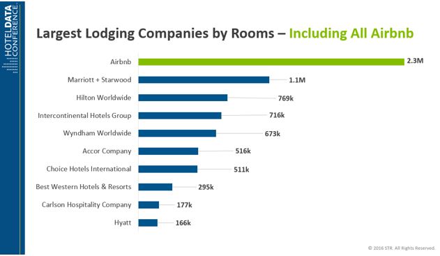 Airbnb has a reported 2.3 million listings worldwide. By raw number of listings, Airbnb is more than twice the size of the combined entity of Marriott International and Starwood Hotels & Resorts Worldwide.
