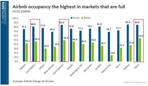 The markets with the highest Airbnb occupancy are also the markets with the highest hotel occupancy. One possible interpretation: Hotels in Los Angeles, San Francisco and Tokyo are already full, so Airbnb is accommodating excess demand.