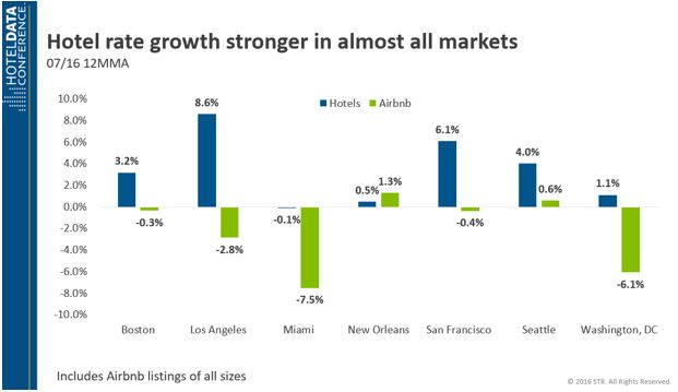 Hotel rate growth was also higher in all markets except New Orleans. Five of the seven markets actually saw negative ADR performance for Airbnb. This could suggest that Airbnb is not immune to its own supply growth (or that Airbnb hosts are less versed in revenue management).