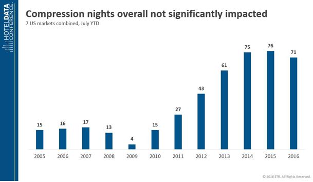 Compression nights are down very slightly from 2014 and 2015—but they are up from 2013. The year of 2013 is arguably a better year to compare to the current year because 2013 was before Airbnb had a significant presence and before hotel supply ramped up. While Airbnb may potentially be impacting compression nights in some markets, it’s also important to consider that these markets are seeing significant hotel supply growth as well.