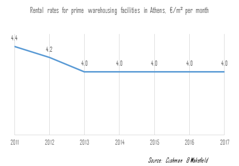 Rental rates in Greece’s warehousing property market segment have been growing in sync with the country’s GDP, falling during the recession. According to NAI Hellas, the rental rate for warehousing facilities in the Greek prime property market segment grew from €4/m2 per month in 2004 to €6/m2 per month in 2008. In 2009, due to the economic crisis, the demand fell drastically and in some instances the rental rate declined by €1/m² at once. According to Cushman & Wakefield, the rental rate for warehouses in Athens has been pegged at €4/m² for the past five years.