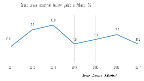 However, the average warehousing property yield in Athens is declining. According to Cushman & Wakefield, it fell from 13% in 2013 to 11% in June 2017.
