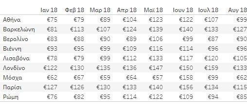 The chart below shows (in Greek) the average hotel prices for nine European capitals (Athens, Barcelona, Berlin, Vienna, Lisbon, London, Moscow, Paris and Rome from top to bottom) as they evolved from January 2018 to August 2018: