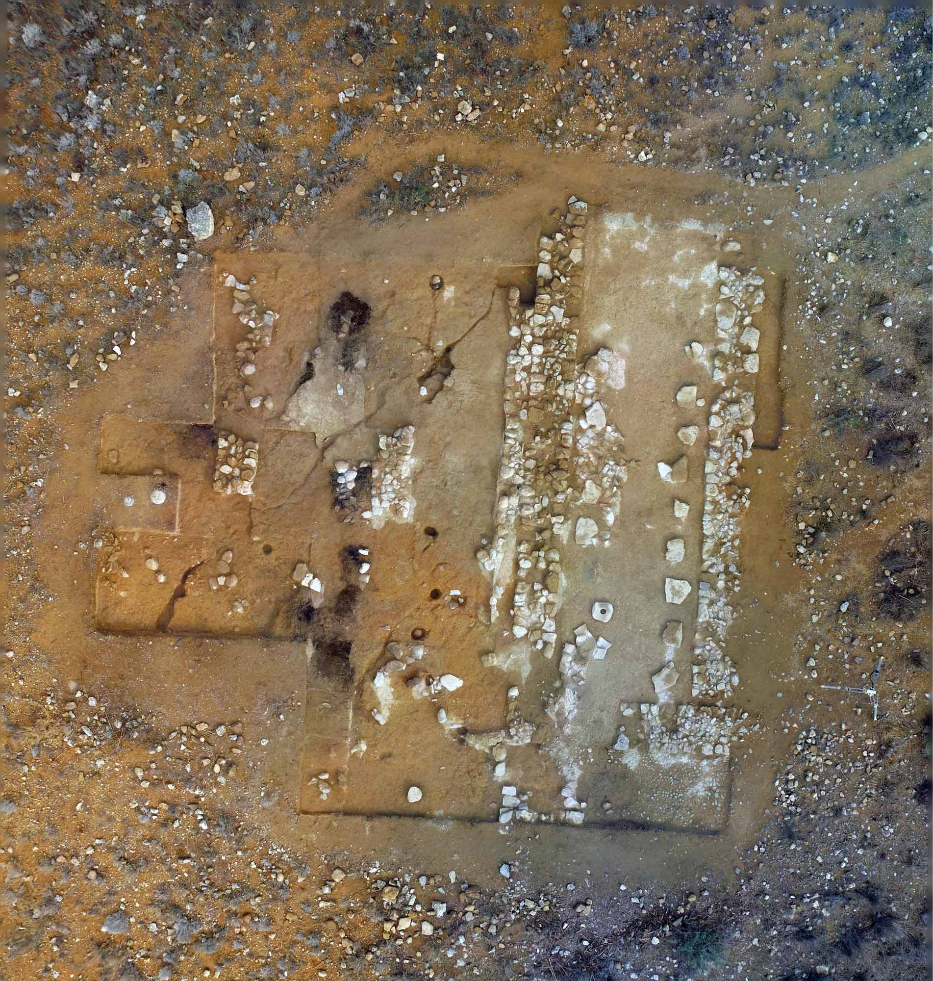 On the west part of the room the plaster floor was burnt and a thick layer of ashes, about 6cm in depth was found, as a result of a fire that caused the destruction of the building. In the same area, the roof was found collapsed above the same layer of ashes. A rectangular stone with a pivot hole may have supported a post or a door. In the next area to the west, another wall, parallel and adjoining the west wall of the pithos room was found, possibly representing a later phase. The floor was not so well preserved but it was obvious that a mixture of plaster covered the bedrock surface and, a number of circular holes were noted. Some of them may represent tree holes and their roots causing crevices in the bedrock, but others are postholes. One of them, on the NW side, contained upright diabase stones, while others, lined with gypsum may have been holding storage jars in place. Traces of heavy fire were also noted throughout the western part of this room; the subdividing walls were destroyed in this process and only small fragments of them were preserved. It is not clear therefore, whether this was originally a larger room, which was then subdivided in the later phase, into two smaller long rooms, because the fire and destruction that followed, obliterated this evidence. Pithoi were found burnt, throughout the area, and, again the collapsed roof sealed the burnt layer at some points. On the south side of the same room, smaller storage jars with incised and stamped decoration were found in association with stone grinders, a small bronze blade, diabase tools and a gaming stone. More gaming stones were found in reuse in the wall construction and some were found strewn around the surface of the small hill. A stepped limestone object was also found in the layer of destruction.