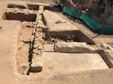 The excavations of 2013 and 2017 had revealed two walls, one with a North-South orientation and the other with an East-West one. These walls delineated the corner of a basin covered with hydraulic mortar.