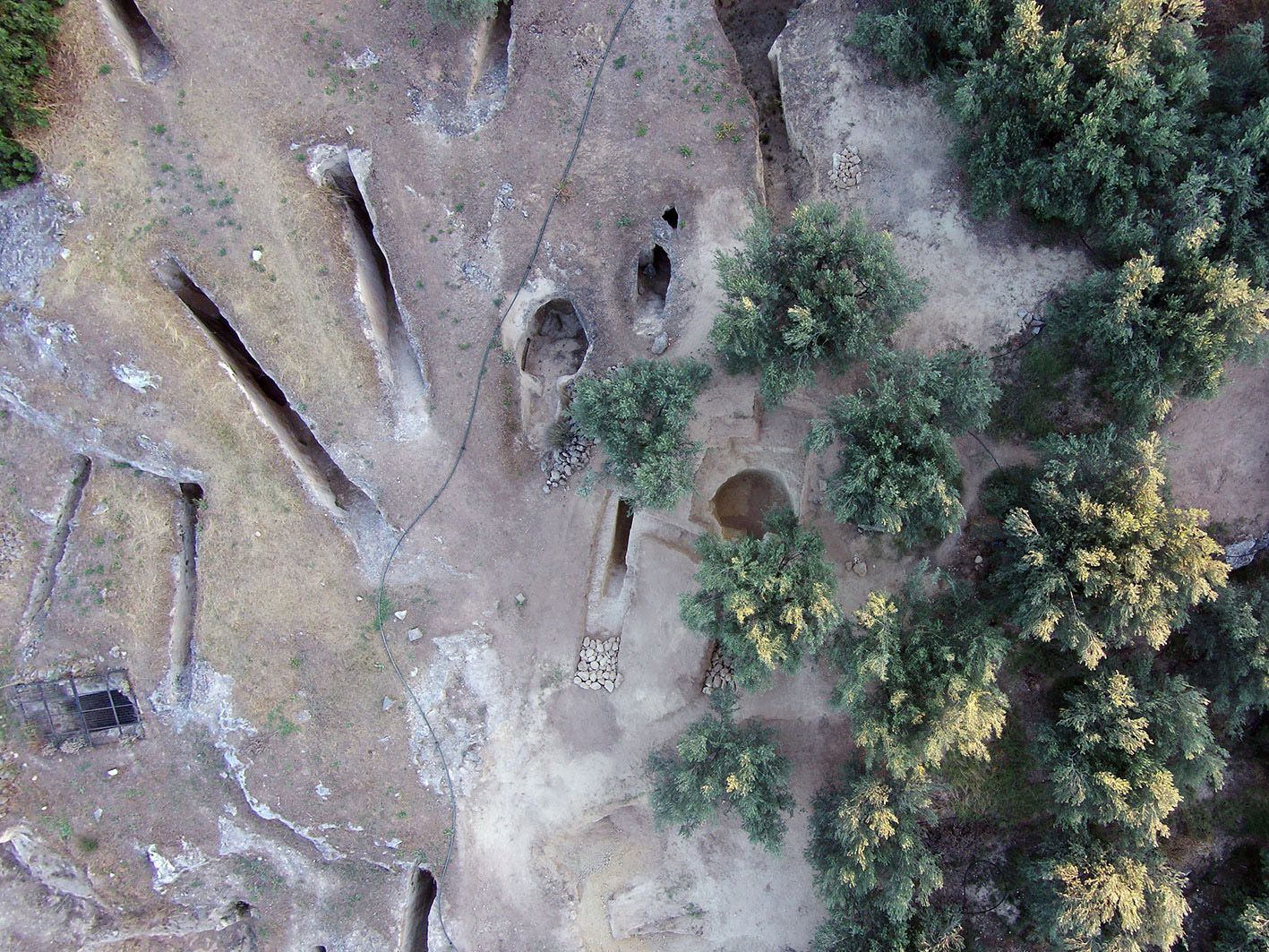 Aerial photograph of the passageway/ dromos and chamber of the two new intact tombs on the east side of the Mycenaean cemetery at Aidonia, Nemea, including the tombs from the earlier excavation (photo: Ephorate of Antiquities of Corinth)