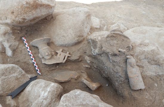 They also included an aryballos – a small rounded jar – of faience and clay statuettes depicting a female figure sitting on a throne holding a pigeon, and of an enthroned Sphinx with a lyre. Of two vessels found with sculpted figures, one may depict Hercules. All of these date to the Archaic era, the ministry verified in a statement.
