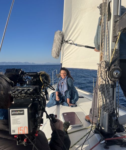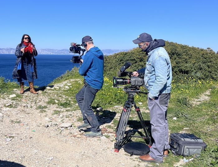 A moment from the filming of the “Treasures of the World with Bettany Hughes” episode on Rhodes.