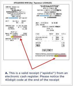 Furthermore, all suppliers of goods and services are obliged to issue receipts to their customers. Consumer is not obliged to pay, in cash or by card, if he/she is not provided with a valid payment receipt (“apódixi”).