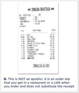 So in all cases, before you pay you have the right to ask for a receipt and you are not obliged to pay if you don’t get one. It’s so simple to say in Greek: “Apódixi please”!