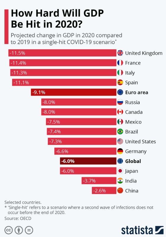 The OECD released its latest Economic Outlook on Wednesday, revealing the projected impact the COVID-19 pandemic will have on global GDP in 2020. When assuming there will be no second wave of infections in 2020, gross domestic product is currently expected to be down by 6 percent last year. Should we encounter a ‘double-hit’ scenario however, this is forecast to increase to a 7.6 percent drop.