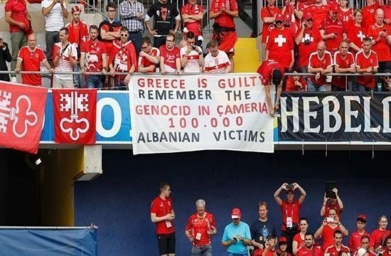 A group of Albanian fans hung a misspelt banner from the stands of the stadium during the match between Albania and Switzerland at the Euro2016 France that read ‘Greece is guilty. Remember the genocid (genocide) in Cameria 100,000 Albanian victims’. The new incident comes after a series of provocations by the official Albanian government on the non-existent matter of the ‘Chams’.
