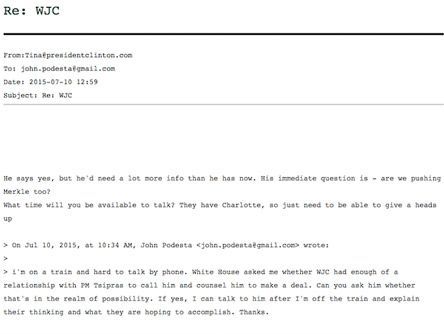 In an alleged email sent to a Clinton staffer, Podesta reportedly asked whether the former president “had enough of a relationship with PM Tsipras to call him and counsel him to make a deal.”