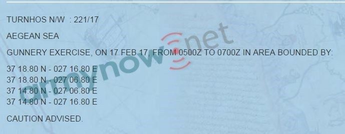 According to a press release by the Hellenic National Defense General staff, the Turkish Navy released a NAVTEX in the very early hours of the 16th of February about a gunnery exercise inside Greek Territorial Waters. The Greek authorities issued another NAVTEX that canceled the Turkish one.