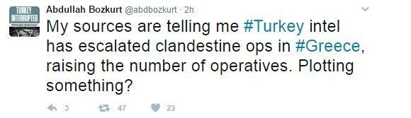 The former editor in chief of the English version of Turkish “Zaman” newspaper, Abdullah Bozkurt posted a tweet on his account warning of increased clandestine operations of Turkish intelligence agents in Greece. The journalist, who was accused by Turkish President Recep Tayyip Erdogan of having close ties with exiled religious leader Fetullah Gulen who was blamed for the failed 2016 military coup, cited sources in his tweet that the number of operatives in Greece had escalated while wondering whether something was being plotted by the Turkish government against Greece.