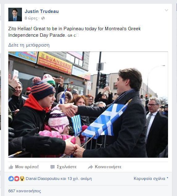 “Zito Helles! Great to be in Papineau today for Montreal’s Greek Independence Day Parade”.