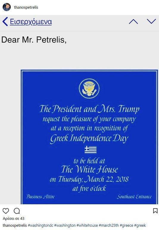 Greek popular singer Thanos Petrelis received an invitation from the White House to perform at an official dinner reception US President Donald Trump and first lady Melania are hosting in celebration of Greek Independence Day on March 25.