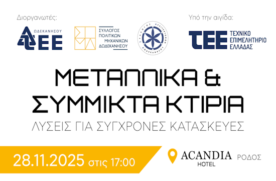 In the context of the evening organized by the Dodecanese TEE in collaboration with the Dodecanese Civil Engineers Association & the Dodecanese Architects Association, which is under the auspices of the Technical Chamber of Greece (TEE), the companies Vavoulas Group [turn key construction] and Hatzimichail Architects + Engineers will participate with specialized presentations and corporate presentations, focusing on know-how and innovation in the field of metal and composite constructions.