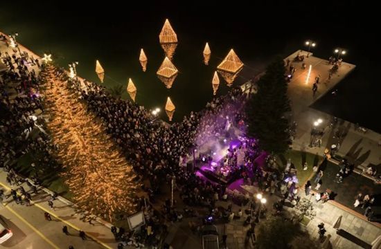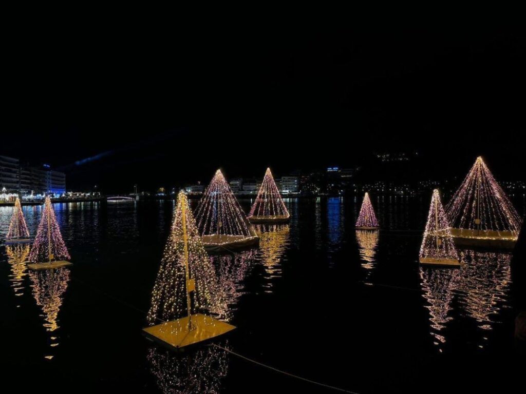 The coastal avenue of Chalkida, in the days leading up to New Years Eve, turns into a setting where time is measured differently. Not with clocks, but with the reversals of the Evripos currents, with the footsteps of passersby who stop to admire the illuminated trees floating in the water, with voices echoing beneath thousands of tiny lights.