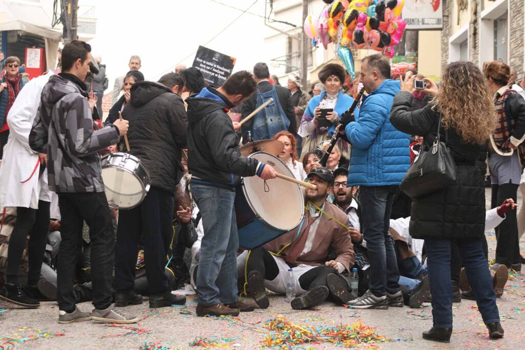 The boulouki, groups of costumed revelers accompanied by brass bands, flood the streets. There are no speakers, only the live, deafening sound of trumpets, saxophones, and drums that vibrates through body and soul. Many masks are painted with soot, as in the old days, giving a wild appearance reminiscent of a time when the custom was used to drive away the winters evil spirits.