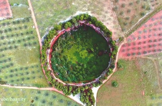 The depth of the small crater is 80 meters within the layers of silt and the diameter is 150 m. Internal vertical walls where someone descends through a tiered portico is rooted the Transfiguration churches in the north and St George in the south. Both churches are carved into the rock. Inside St. George there are inscriptions in Latin characters, a historic inscription that marks the passage of Thomas Paleologos, Ruler of the Peloponnese as well as an old stone baptistery. East of the church there is a small reservoir whose walls are coated with a kind of porcelain and east to a height of 25 meters a hole called “Askitareio” where hermits reached with rope.