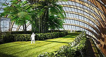 Under the ceiling, a small park-like space exists for guests to relax.