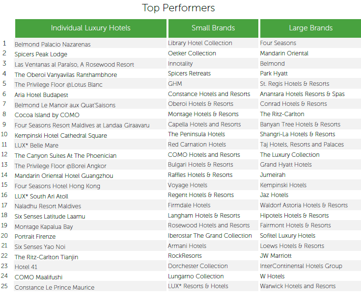 · In terms of overall online guest satisfaction, Four Seasons (GRI™ 93.2%) was the best performing Large Luxury Brand and Library Hotel Collection (GRI™ 96.1%) was the best performing Small Luxury Brand. Belmond Palacio Nazarenas and Spicers Peak Lodge were the best performing Individual Luxury Hotels, both with a GRI™ of 98.1%.