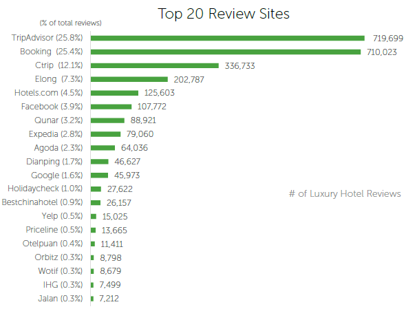 · TripAdvisor was the largest online review source for luxury hotels, generating 26% of total reviews followed closely by Booking.com with 25%. Ctrip overtook Facebook to become the third largest review source.