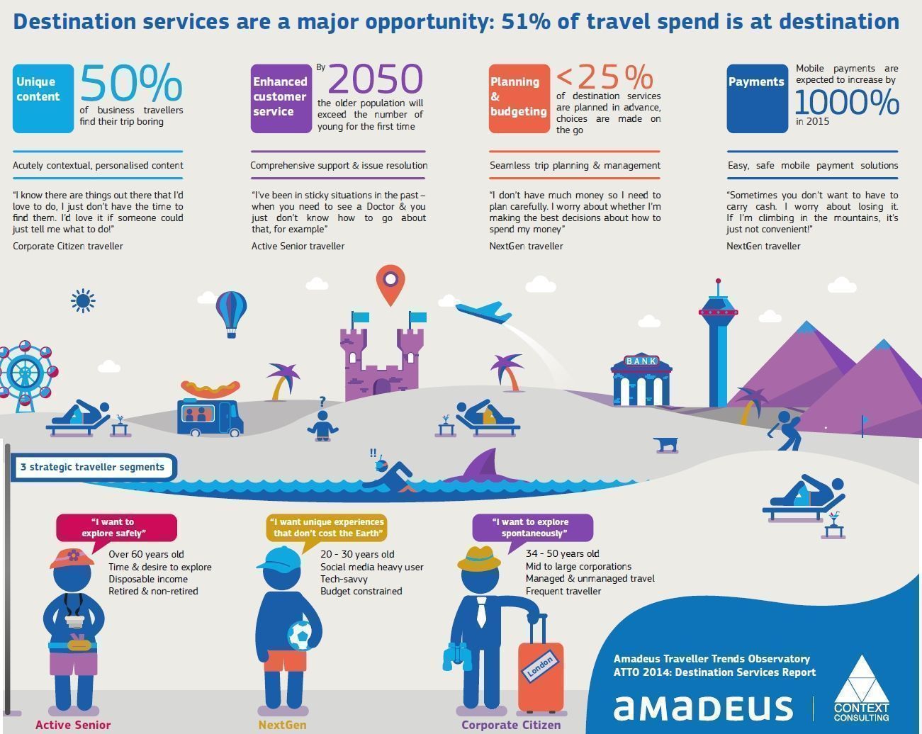 As she noted, we’ve seen NexGen Travellers in the 18 – 30 year old age group, express an interest in affordable yet unique experiences. On the other hand, Active Seniors in the 60+ age range (who will make up 21% of the population by 2050) desire ‘controlled-adventure’ and safe travel experiences. Corporate Citizens, who are frequent business travellers, want spontaneous experiences personalised to their needs, as shown by following infographics: